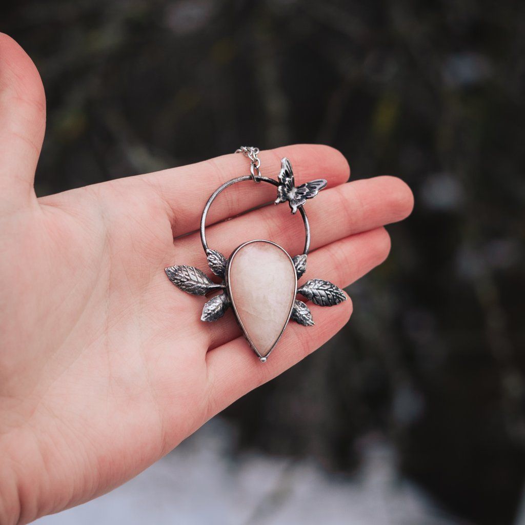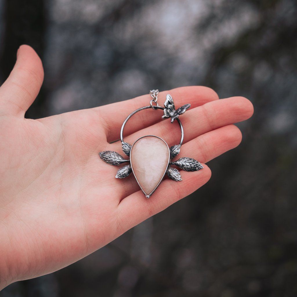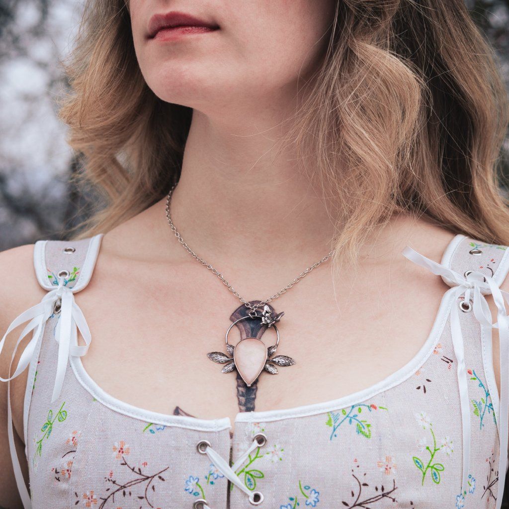Jemný přívěsek s morganitem, lístečky a motýlkem